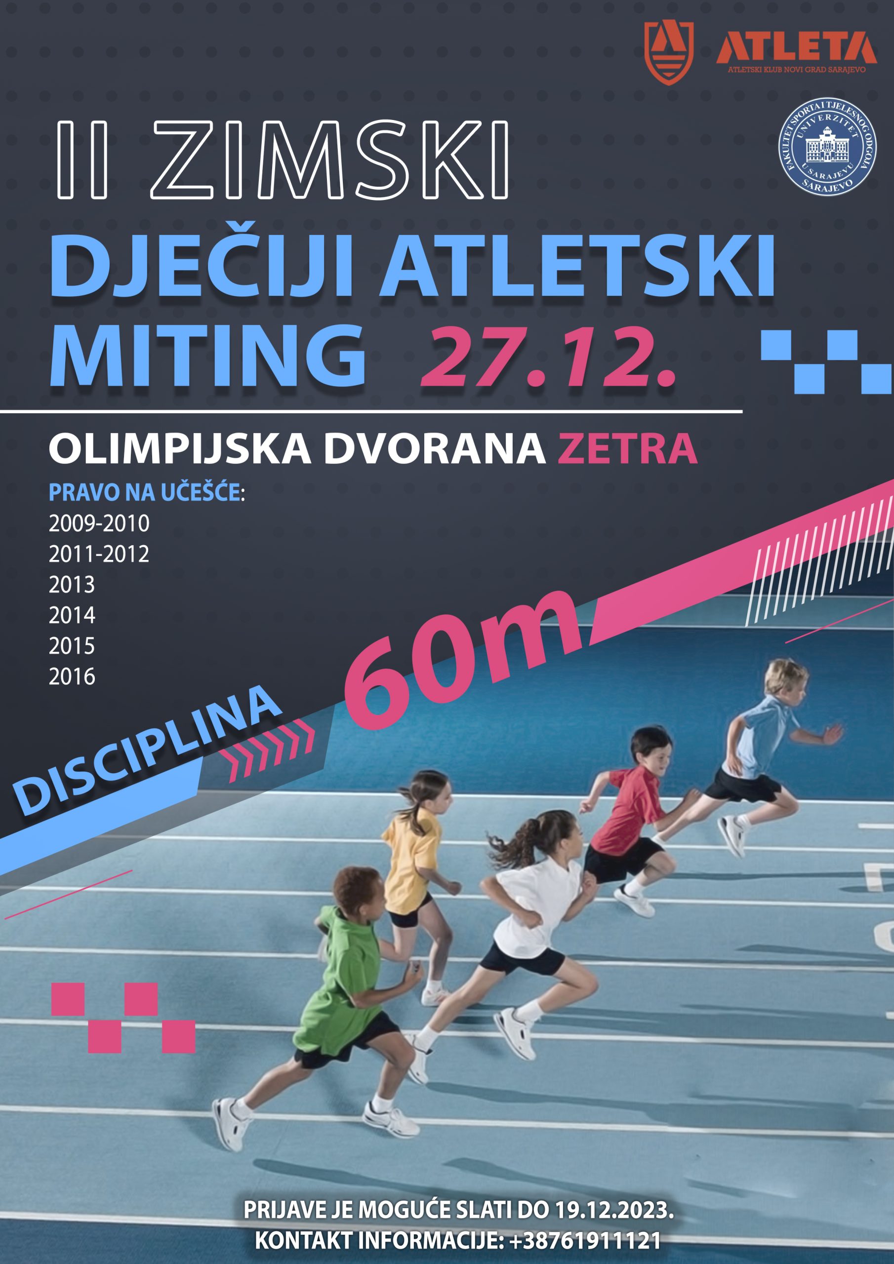 S ponosom najavljujemo da studenti 4. godine Fakulteta sporta i tjelesnog odgoja Univerziteta u Sarajevu u saradnji sa AK Novi grad Sarajevo organizuju II Zimski dječiji atletski miting koji će se održati 27.12.2023. godine u Olimpijskoj dvorani Juan Antonio Samaranch Zetra sa početkom u 11:00h.