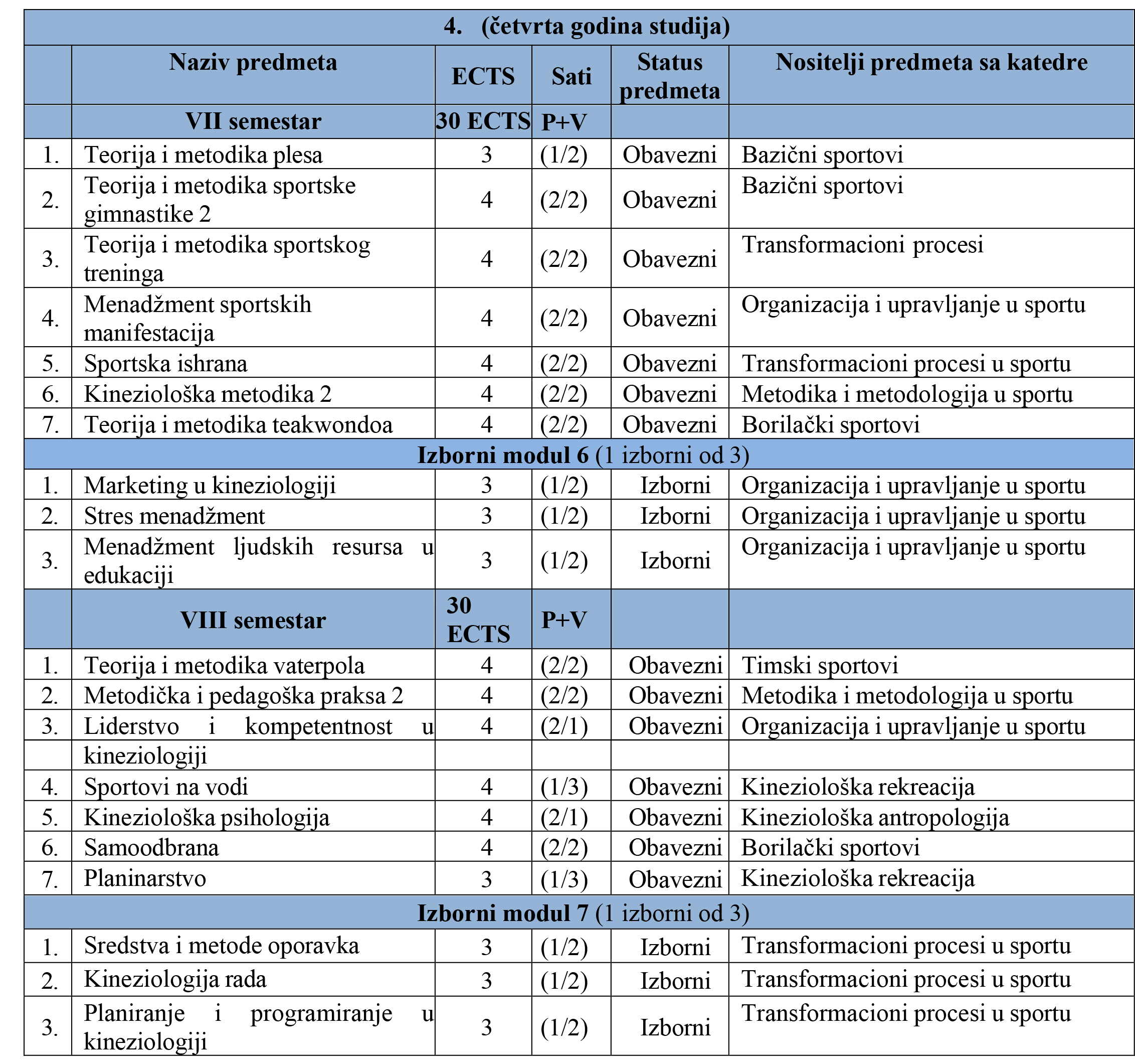 OPĆI SMJER /240 ECTS/ ČETVRTA GODINA