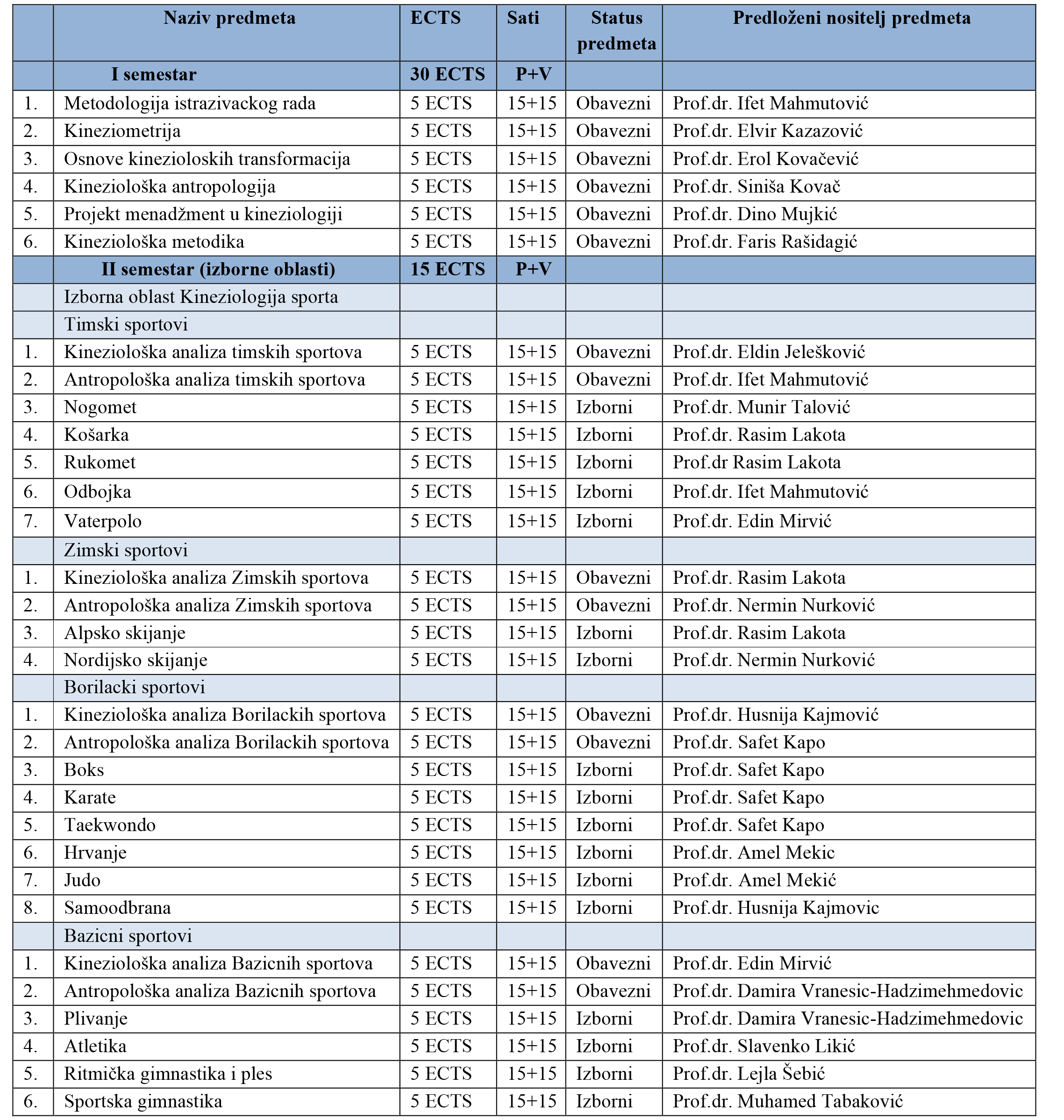 Tabela 1. Nastavni plan master studija ” Kineziološka edukacija ”